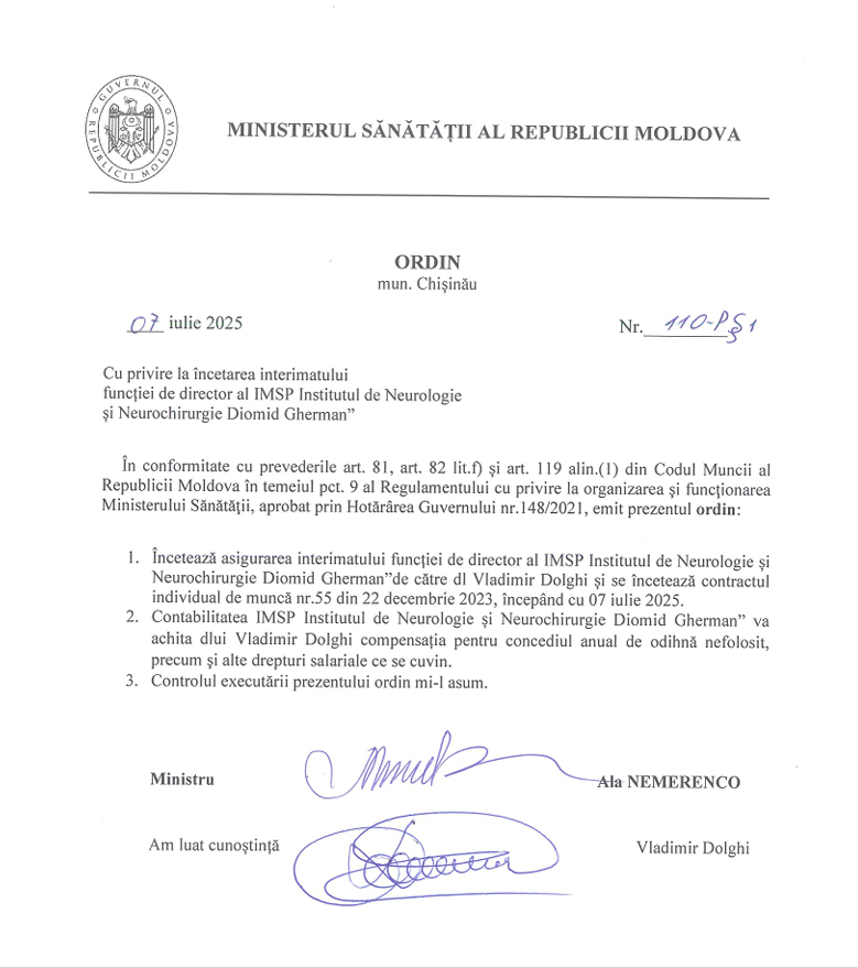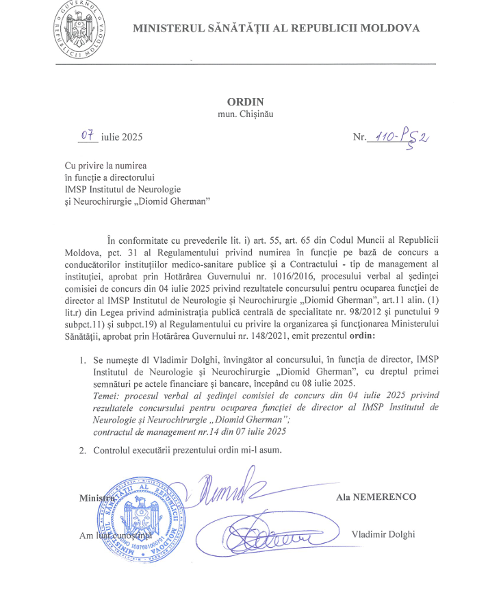 În urma concursului organizat în conformitate cu legislația în vigoare și procesului-verbal al comisiei din 4 iulie 2025, domnul Vladimir Dolghi a fost desemnat câștigător al concursului și numit oficial în funcția de director al IMSP Institutul de Neurologie și Neurochirurgie „Diomid Gherman”, prin Ordinul Ministerului Sănătății al Republicii Moldova din 07 iulie 2025.